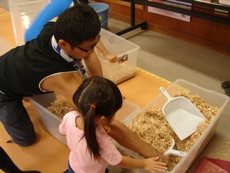 衣装ケースにおがくずをひいて、ふかふかのベッドにします。
