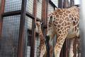 みなさん、こんにちは 赤ちゃんキリンの報告です この日も天気が良かったので、通路まで 前回と違うところは~・・・ 金網越しにお父さんのトーマがいることです 正面からのぞ