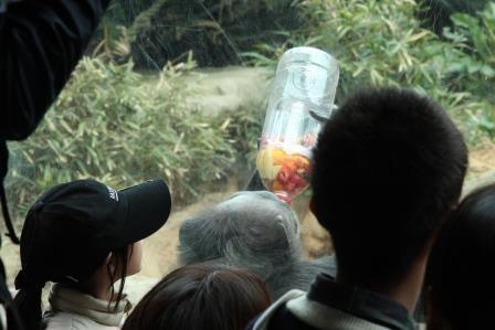 チンパンジーたちが箱や袋、ペットボトルをどうするかな?
