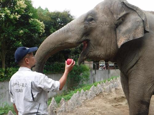 ※果物などは、ゾウの体調を見ながら適量を与えるようにしています。持ち込んだ食べものを直接与えないよう、ご協力をお願いいたします。