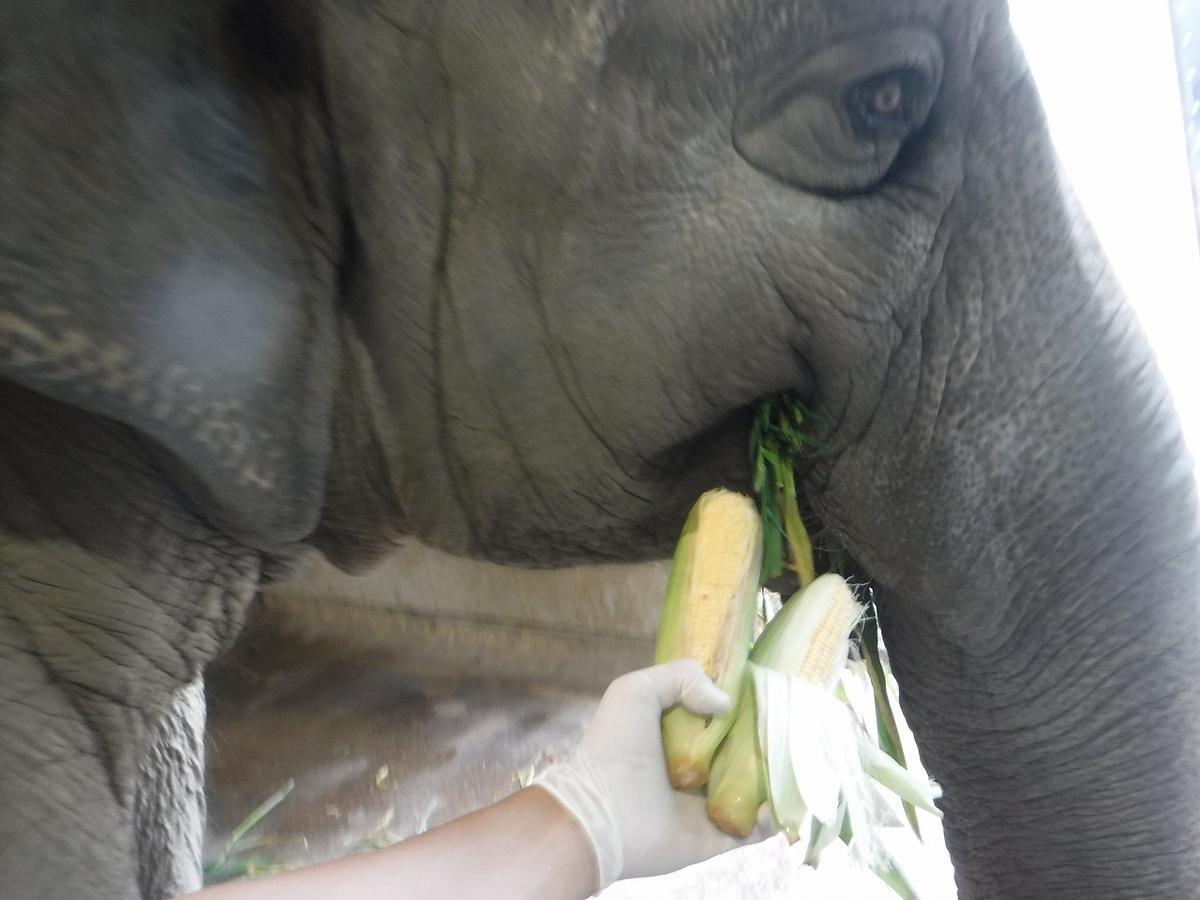 到津の森公園では、ゾウは草や木の枝と葉っぱ、竹や笹などをメインに食べているので、普段は甘いものはあまりあげていません。(爪の手入れや治療などのごほうびにあげるくらいです)
