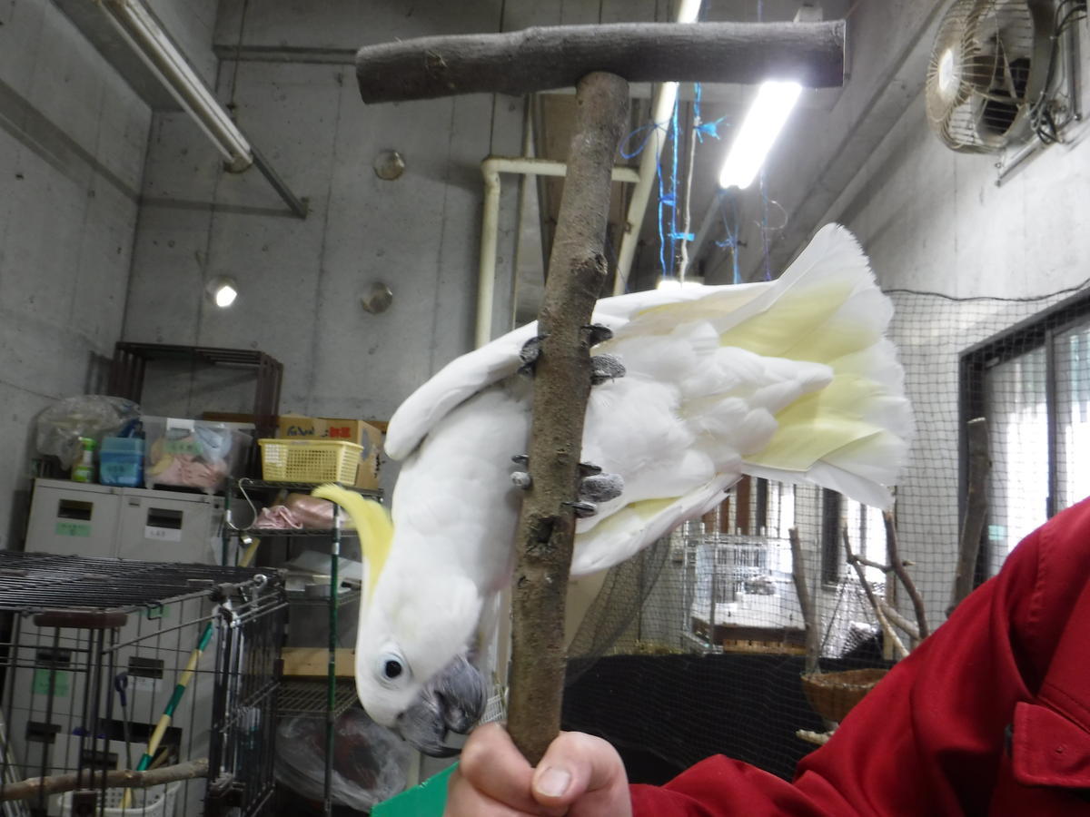オウムたちは飼育スタッフをしっかり見分けるため、それぞれ「このスタッフは好き」、「このスタッフはちょっと苦手…」と態度が全くことなります。信頼関係ができているオウムとスタッフだと、腕に乗せて移動もできるのですが、できればどのスタッフとも一緒に移動ができるようにしたいと、棒に乗ってもらい移動する方法を練習しています。