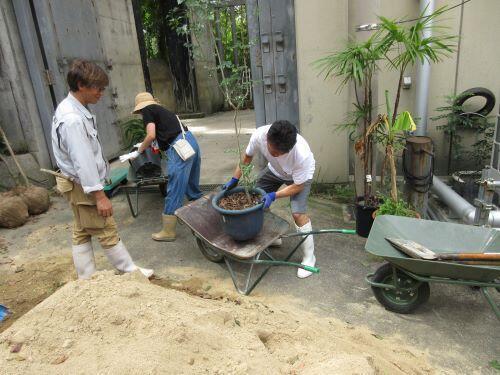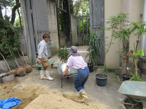 重い砂を乗せた一輪車を何往復も頑張って運んでいただきました
