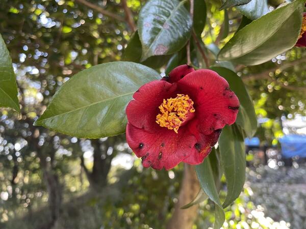 花びらのふちが傷んで黒く変色していたり、小さな穴があいていたりします。これは、メジロなどの小鳥が訪れた痕。ツバキの蜜を吸うとき、メジロは足で花びらつかんで頭をつっこみます。そのときのつかんだ傷が、こうして残るのです。