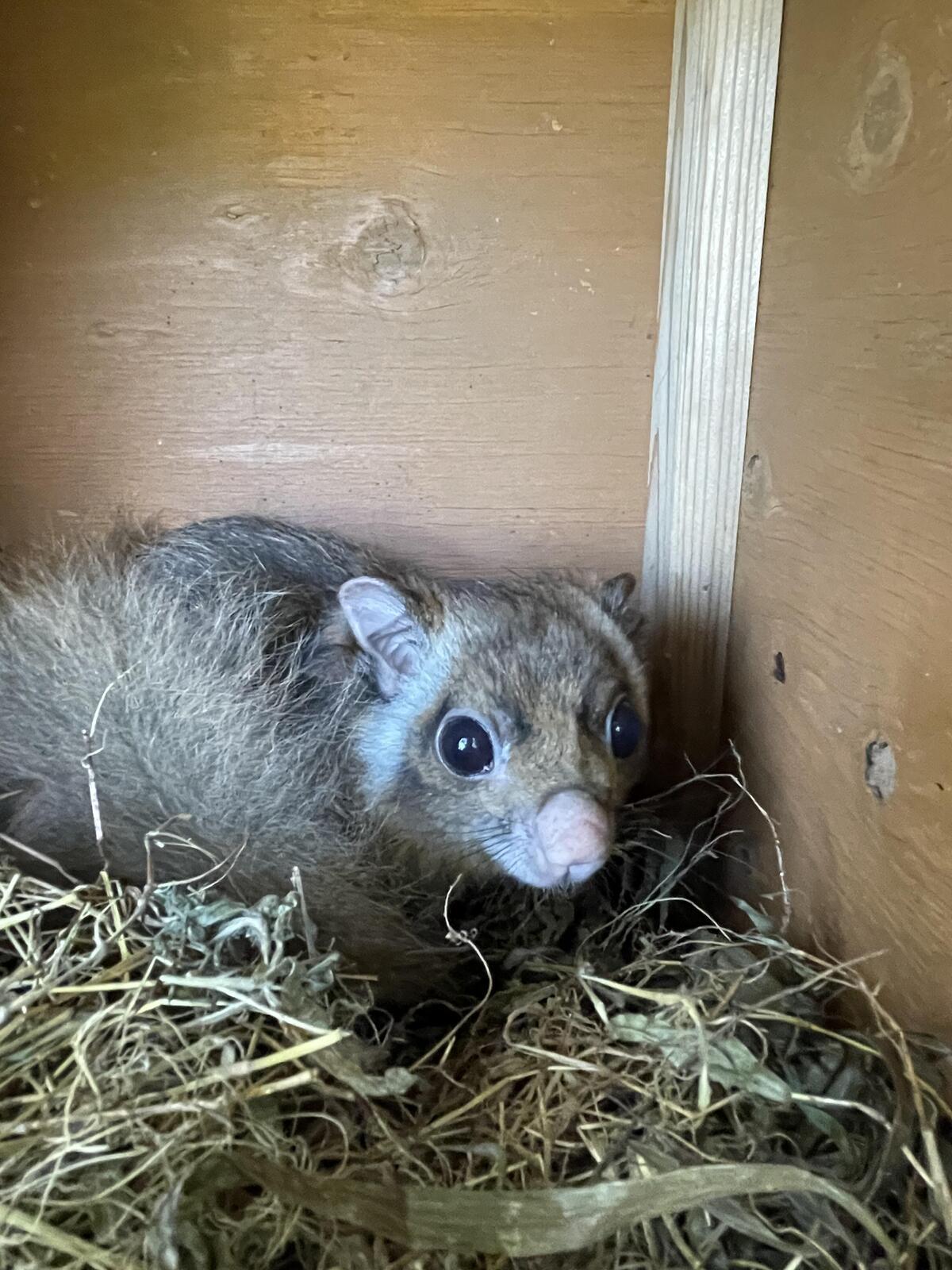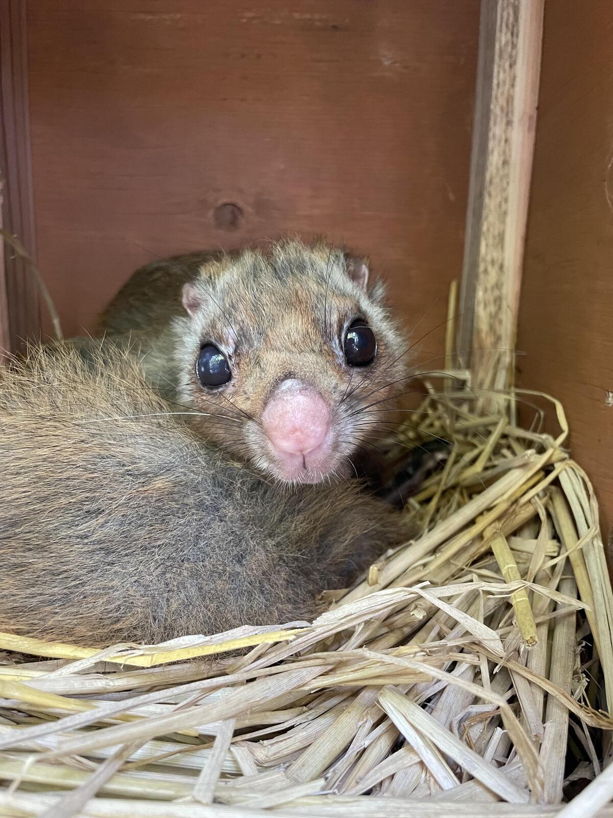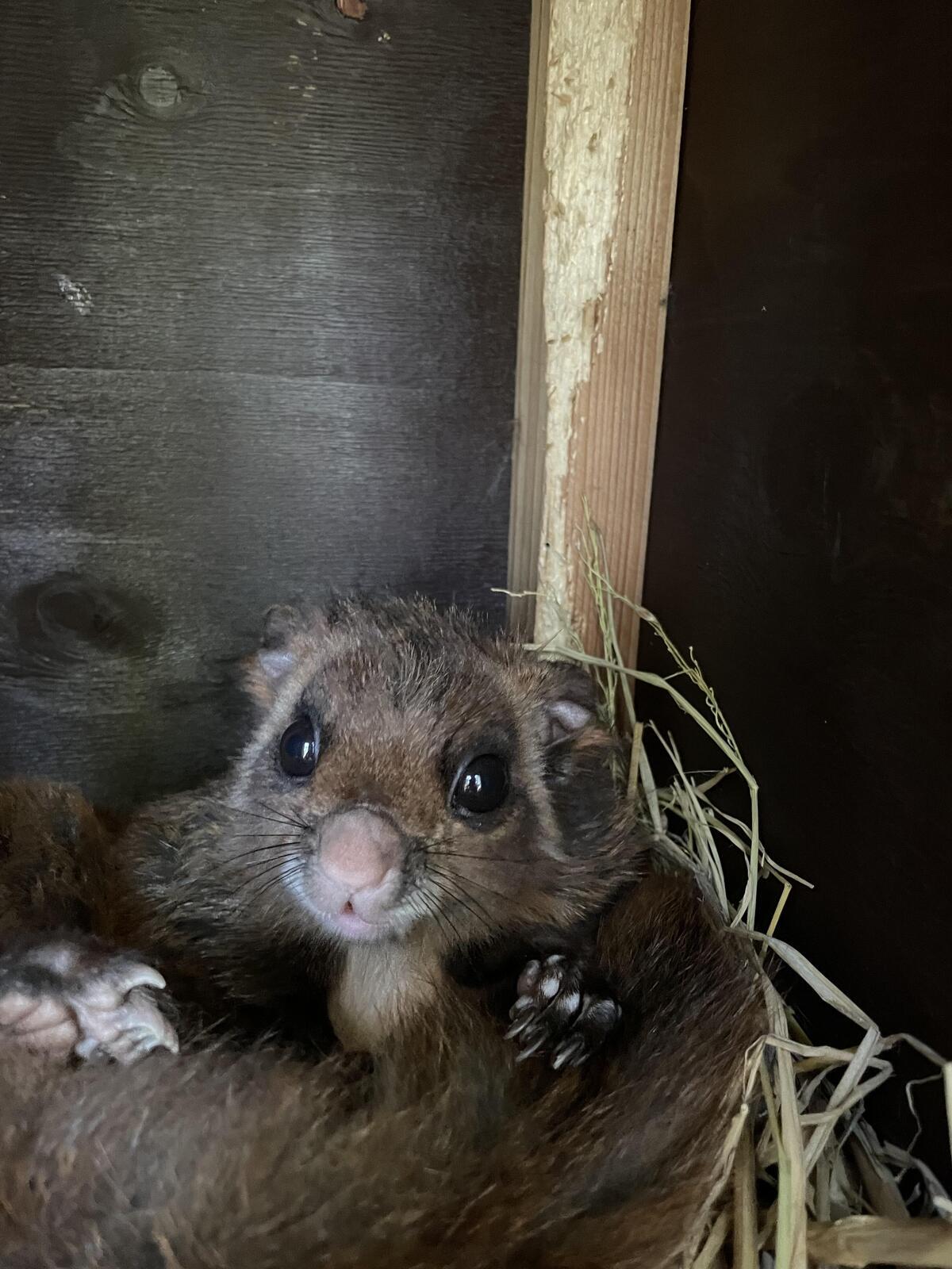 2022年春生まれ。野生から保護されたムササビ。熊本市動植物園より来園。他のムササビたちより毛色が濃くこげ茶色が目立つ。尾が短い。