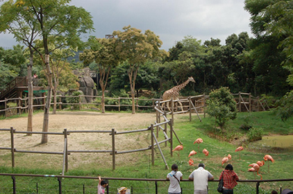 みる場所によってライオンの背中越しに草食動物が見えたり、キリンの向こうにライオンが見えたりします。レストランや芝生広場からこの広いパノラマをみることができ、ゆったりとくつろげるエリアです。