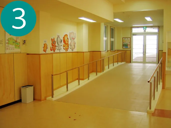 収容人数約400名。園内へのスロープがあり、男女別・多目的トイレ、手洗い場などを設置しています。なお、施設内2階への通路は階段になりますので、用途にあわせてスロープをご利用ください。