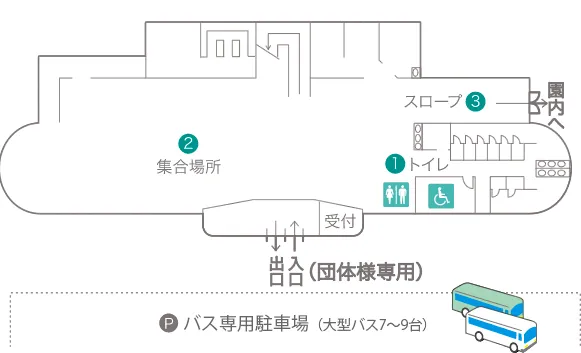 バス駐車場の目の前の施設が子どもホールです。戦前からあるこの子どもホールは、1936年に、一般公募により命名されました。団体のお客様をお迎えする団体専用入口として平成17年に改装オープンしました。中央の2つの扉が団体専用の入口出口となっています。丸い窓が団体様の入園受付窓口ですので、ご引率の代表者の方はこちらで当日の受付をお願いいたします。